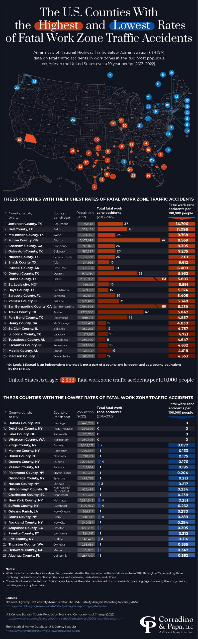 Our team at Corradino & Papa has compiled and analyzed data from the National Highway Traffic Safety Administration (NHTSA) on work zone traffic accidents over the past ten years. This analysis identifies which counties have had the highest, and lowest, rates of fatal work zone accidents.